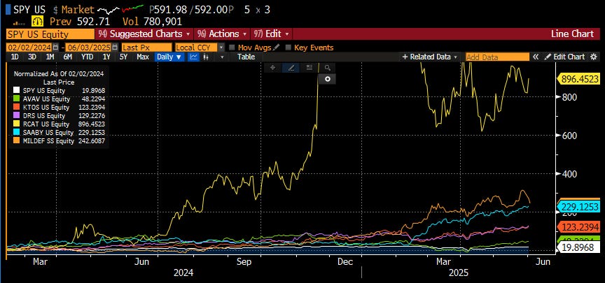Chart 1, above, compares the performance of defense industry names I owned (colored lines) to the S&P 500 Index (white line - SPY). The S&P 500 was up 20 percent over that period. The defense industry names were up between 48 and 896 percent, with all but one more than doubling. The average was 278 percent, or 13.9x the S&P 500 Index.